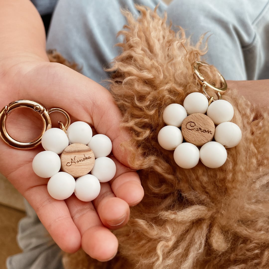 ウッドビーズとシリコンのホワイトビーズを テグスで合わせてデイジーに♡ ウッドビーズ(15mm)にお名前を彫刻します。 カラビナで簡単に取り外し出来る為、首輪や、リード、飼い主様のキーホルダーにも出来ます。 別売りのわんちゃん用マクラメチョーカーと一緒のご購入もオススメです♡ 彫刻したいご希望のお名前をご購入時の備考欄にご記入下さい。 アルファベット、筆記体に基本彫刻しますが、ひらがなや、筆記体なしも可能です。 お気軽にお問合せください。 ご購入後、フォントの確認などでご記載のアドレスにご連絡致します。 またはご購入後、メッセージ頂けますと幸いです。 裏面に飼い主様の携帯番号を彫刻する事もできます。 ご希望があれば、備考欄にご記入下さい。 プラス料金は頂きません。