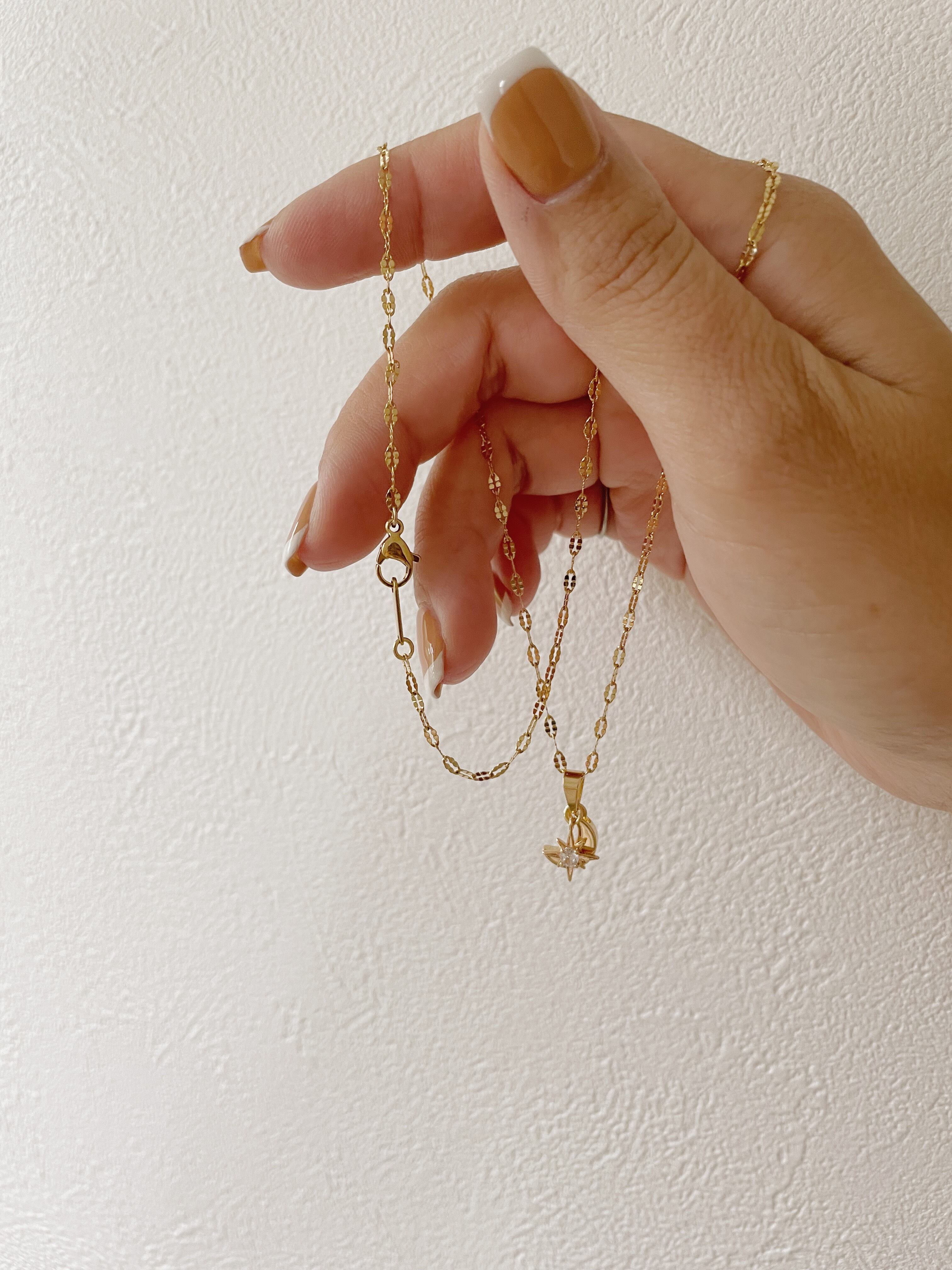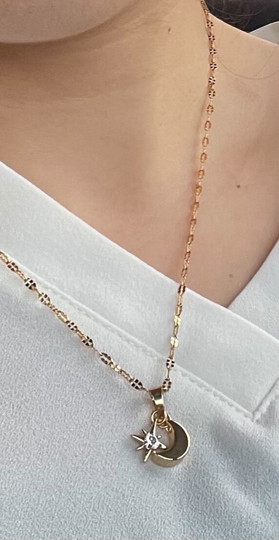 小粒で華奢な18kgpの月と星(ジルコニア付き)のチャームを重ね付けしスタイリッシュな印象に